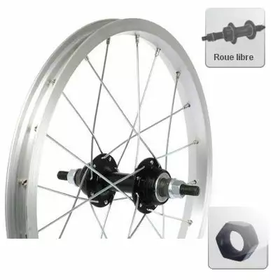 Avec sa jante à paroi simple large de 21 mm, la roue arrière de couleur argent est équipée d’un moyeu 16 trous et de son axe à boulons en aluminium et acier. Un filetage est présent pour y installer une roue libre. La roue a une ETRTO est de 21-203. Il est possible d’y installer des pneus 12 pouces ayant une ETRTO comprise entre 35-203 et 62-203 comme le pneu tringles souples 12 pouces ou le pneu tringles rigides avec crampons. Un article complet sur les dimensions des pneus vélo est proposé sur notre blog Citycle.