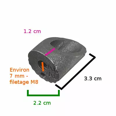 Cet écrou a un filetage de M8 x 22. Il est à boulonner à l’extrémité d’une tige de fixation de plongeur type : vis de serrage pour potence 150-200.