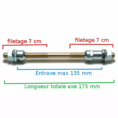 L’entraxe mesure 135 mm et se règle en fonction de la largeur du moyeu arrière (7 cm de longueur de filetage de chaque côté). L’axe se bloque avec des écrous type M9.5 sur chaque extrémité et s’installe avec une clé à cône de moyeu et de la graisse d’entretien. Nous proposons également des billes livrées avec un tube de graisse pour remettre à neuf votre moyeu.