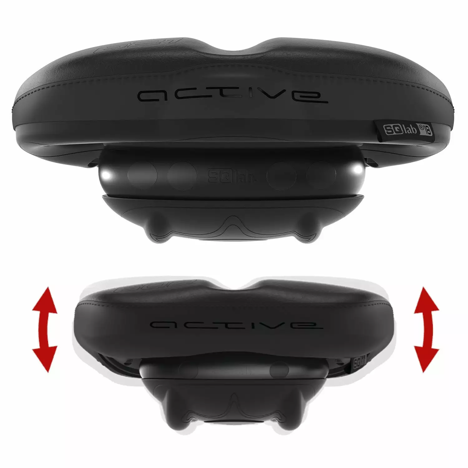 La selle vélo SQlab est aussi dotée de la technologie Active de SQlab (voir photo 5) : c’est-à-dire que sa construction suit le mouvement latéral du bassin lorsque le cycliste pédale pour augmenter son confort mais aussi l’efficacité de son pédalage. En effet, le cycliste ressent alors moins de pression sur les disques intervertébraux et la pression sur les ischions s’en trouve encore réduite. Il est possible d’ajuster la flexibilité du mouvement actif en fonction du poids du corps de chaque cycliste à l’aide de 2 à 4 bâtons à placer dans l’amortisseur situé sous la selle