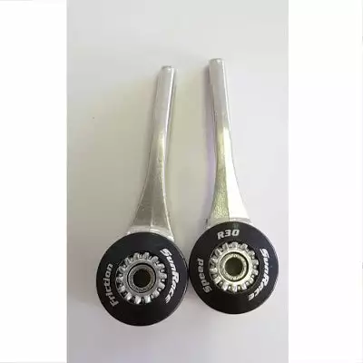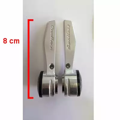 Cette paire de leviers de changement de vitesses a pour fonction de contrôler un couple de dérailleur avant 3 vitesses et de dérailleur arrière 7 vitesses d’un vélo. Le levier droit est indexé et le levier gauche est à friction, ce qui signifie que pour la manette gauche, la variation de vitesses s’opère de manière continue et le cran s’affine à l’oreille.